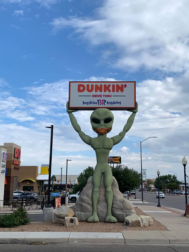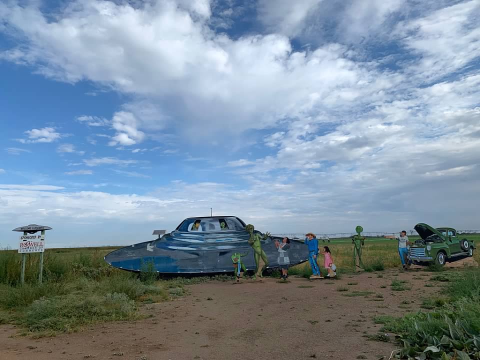 | 3 Sun | Roswell UFO Museum, alien at McD’s, alien at Dunkin, and Roswell welcome signs Roswell, NM | Artesia, NM | Rental Car | 8:15PM | 9:00AM | Because we couldn’t find a vacant hotel in Roswell, we ended up 40 mins away. The Roswell UFO Museum is small but if you’re as fascinated with the history, it’s worth the small price of admission. The are aliens everywhere in Roswell! The town as fully embraced its unique history and we loved seeing all of the big name chain restaurants incorporate it into their exteriors. |