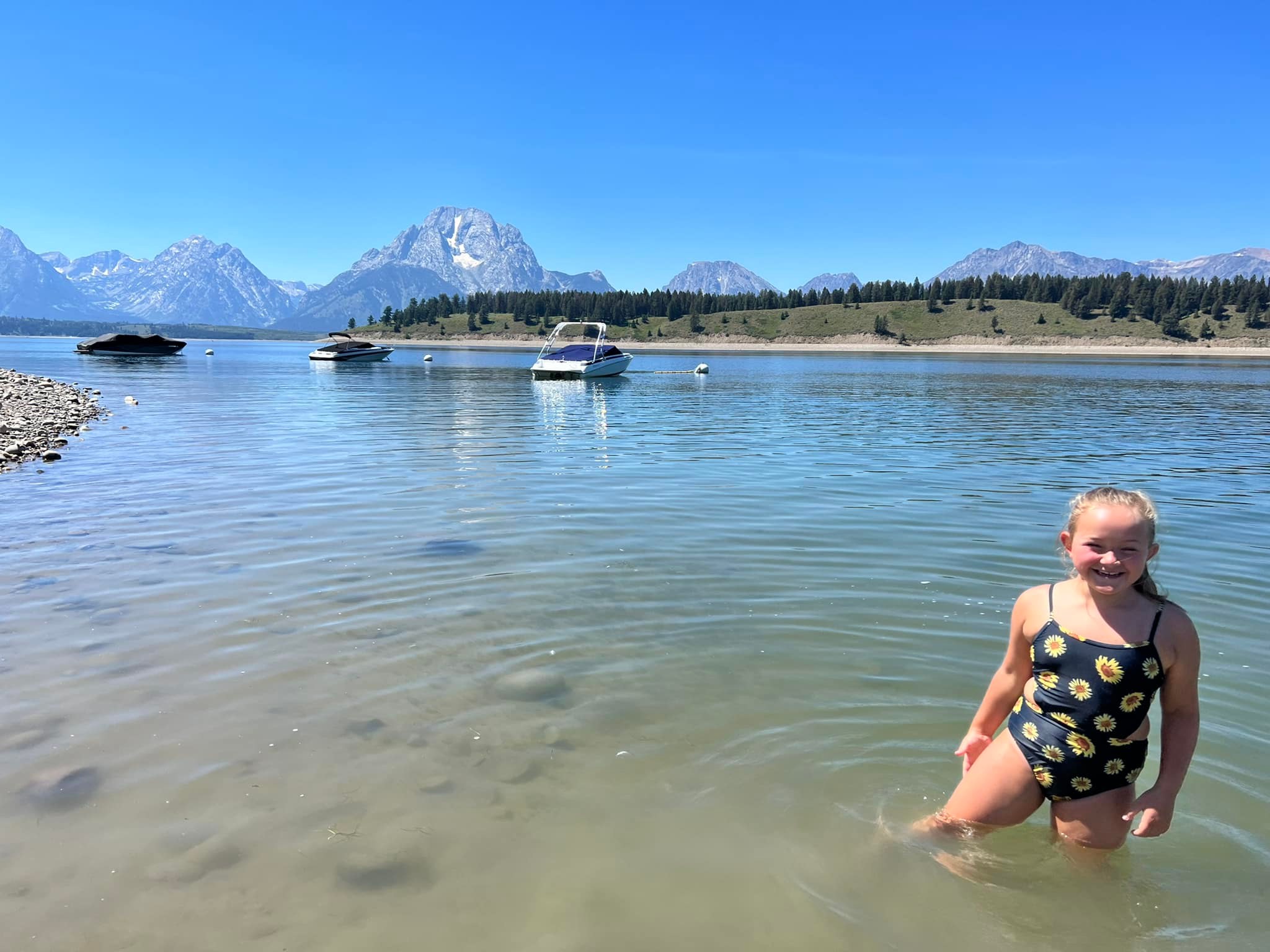 Day 2 was spent at Grand Teton National Park with Jenny Lake and and swimming at Jackson Lake on the list. We packed a picnic lunch and drove to Signal Mountain for a picnic, bringing our bear spray that I’m happy to say we didn’t have to use. The water was cold but it didn’t stop my 8-year old from swimming.