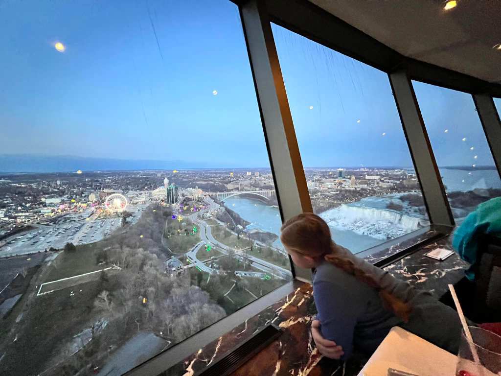 We had an evening dinner reservation at the Skylon Tower revolving restaurant with legendary views of the falls. This is an absolute must while visiting Niagara Falls! The restaurant silently rotates 360 degrees every hour, giving diners a constantly changing vantage point. Make sure you book this well in advance because this might be the most popular dinner spot in Ontario – and rightfully so with these spectacular views.